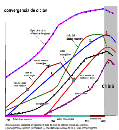 En fin, es necesario señalar que la convergencia de numerosas “crisis” mundiales puede indicar la existencia de una perturbación grave pero no necesariamente el despliegue de un proceso de decadencia general del sistema. La decadencia aparece como la última etapa de un largo súper ciclo histórico, su fase declinante, su envejecimiento irreversible (su senilidad), el agotamiento de sus diversas funciones. Extremando los reduccionismos tan practicados por las “ciencias sociales” podríamos hablar de “ciclos” energético, alimentario, militar, financiero, productivo, estatal, etc., y así describir en cada caso trayectorias que despegan en Occidente entre fines del siglo XVIII y comienzos del siglo XIX con raíces anteriores e involucrando espacios geográficos crecientes hasta asumir finalmente una dimensión planetaria y luego declinar cada uno de ellos. La coincidencia histórica de todas esas declinaciones y la fácil detección de densas interrelaciones entre todos esos “ciclos” nos sugieren la existencia de un único súper ciclo que los incluye a todos. Dicho de otra manera, la hipótesis es que se trata del ciclo de la civilización burguesa que se expresa a través de una multiplicidad de “aspectos” (productivo, moral, político, militar, ambiental, etc.).